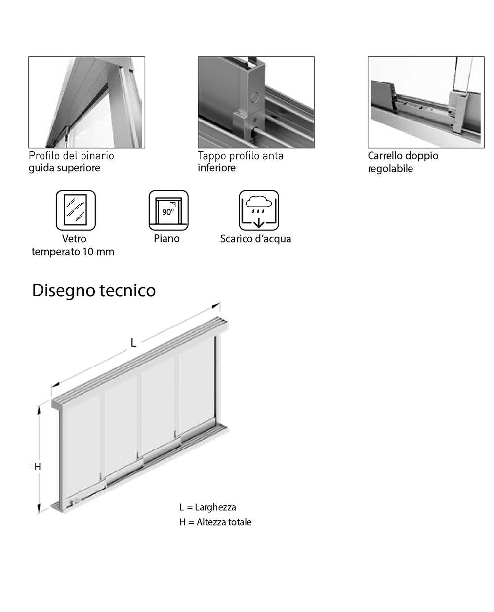 Le ante scorrevoli, realizzate in vetro temperato da 10 mm senza telaio laterale, garantiscono massima trasparenza e una vista panoramica continua.