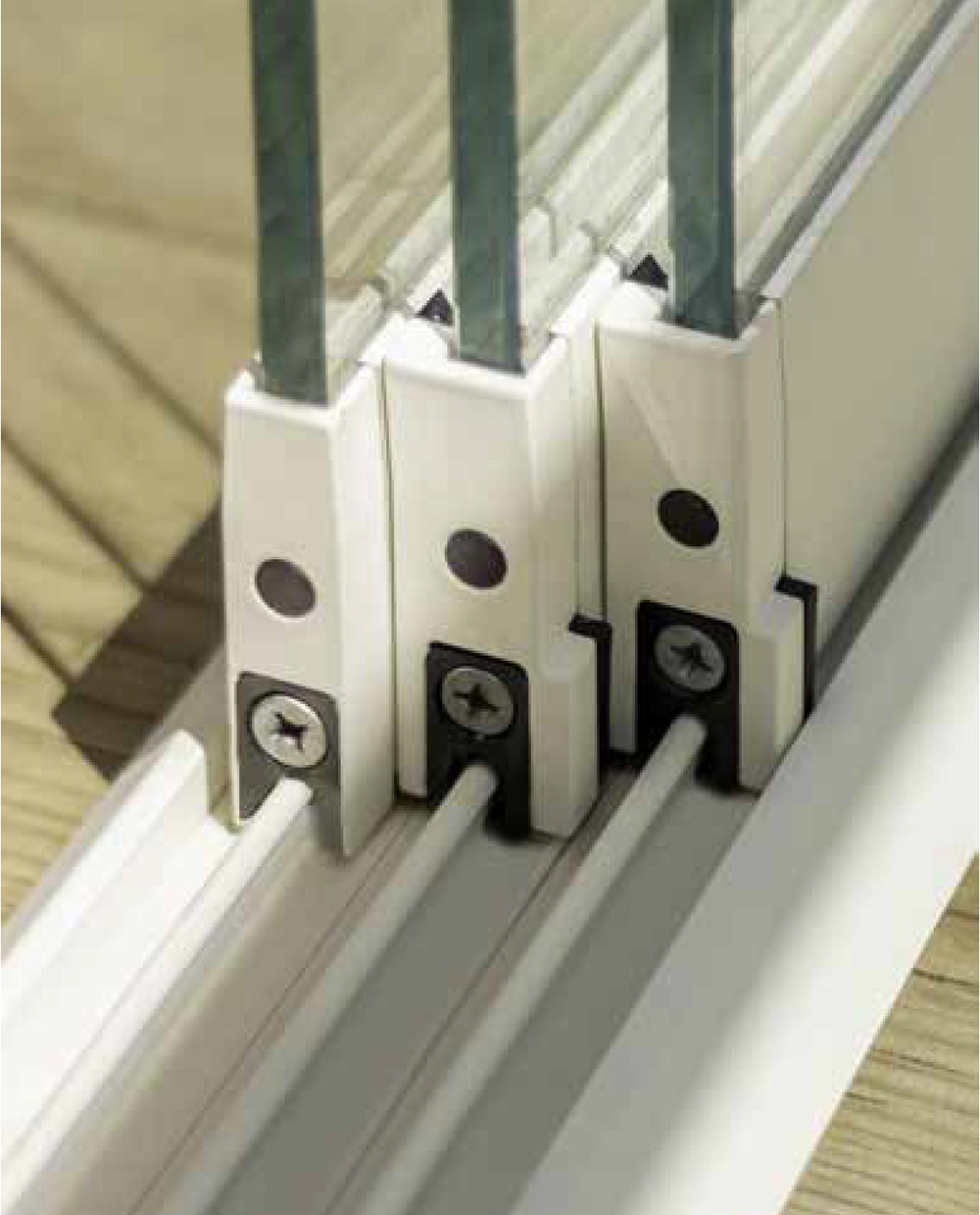 I profili in policarbonato, dotati di spazzolini di tenuta, contribuiscono a ridurre vibrazioni e rumori durante lo scorrimento delle ante, migliorando al tempo stesso la protezione da aria e polvere.